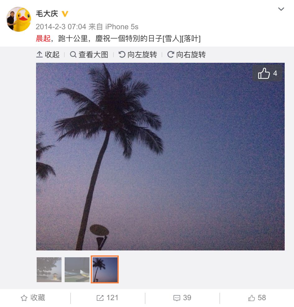 优客工场创始人毛大庆是企业界的资深跑者。2014年2月3日,大年初四,马尔代夫晨曦微露,毛大庆就起来跑步了,以这样的方式来庆祝自己的45岁生日。