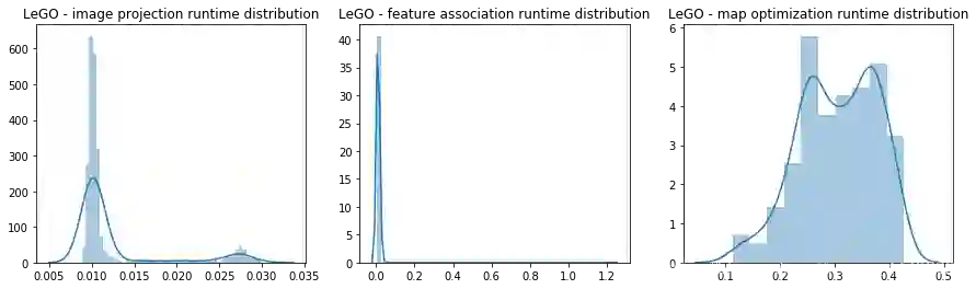 下面是LeGO LOAM的三个主要线程的处理时间的分布曲线。分别是image projection线程(将扫描帧投影到二维矩阵,并做一系列的预处理),feature association线程(与LOAM大概一致,特征点的提取和匹配),以及map optimization线程(低频激发的全局优化线程)。