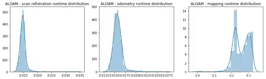 • A-LOAM has the same logical with LOAM, but its performance is much worse.下面是对ALOAM的三个线程的运行时间的分析(以下的运行测试都是再i5 9300 cpu上进行的),分别是scan registration线程,odometry线程,和mapping线程。其中mapping是进行全局优化的线程,另外两个线程则和实时性息息相关。
