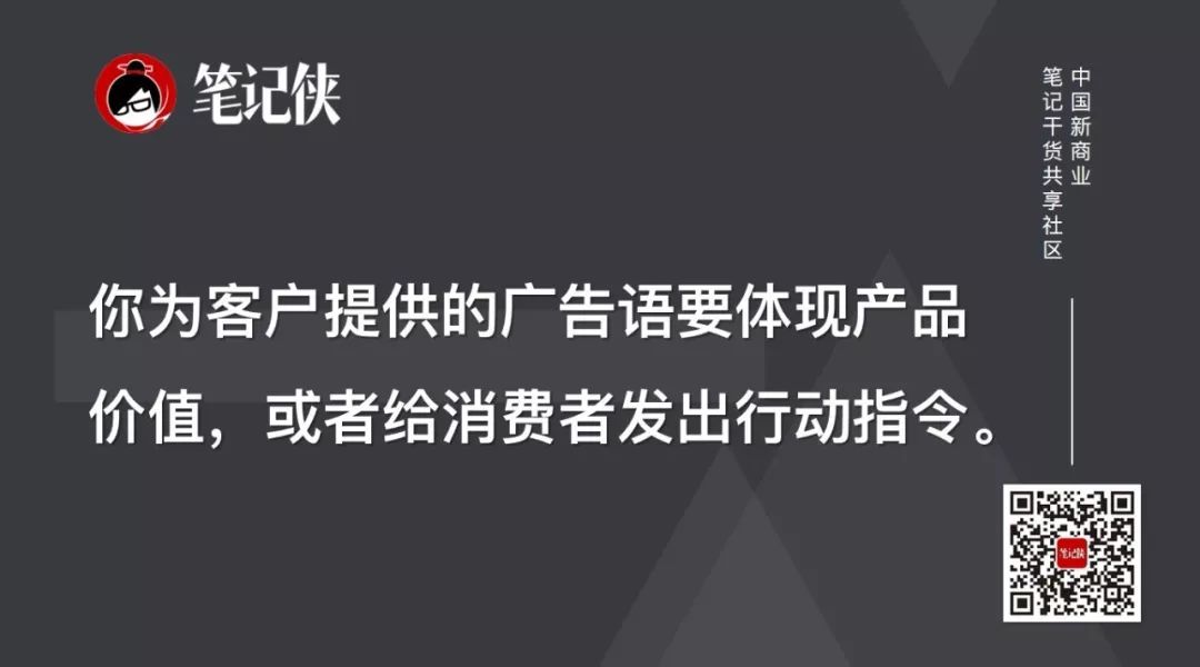 什么意思呢?就是你为客户提供的广告语要体现产品价值,或者给消费者发出行动指令。