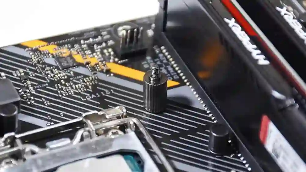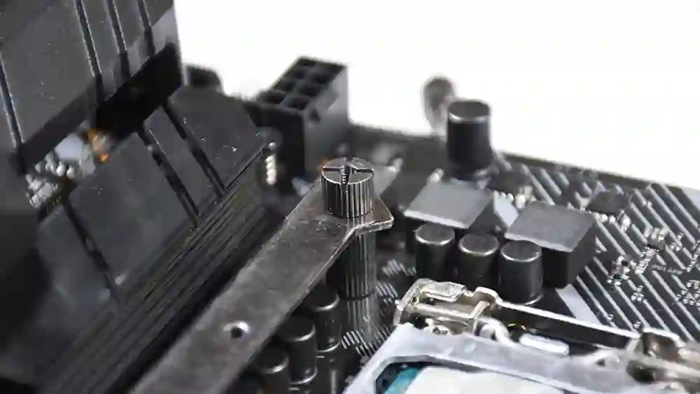 接着将两条金属支架按照对应孔位放置在螺丝柱体上,这里是需要区别 Intel 和 AMD 平台的,然后再用另外的螺丝加以固定。