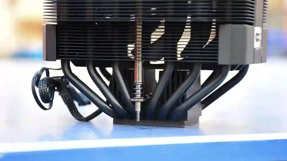 所有的铜管最终聚集到散热底座上,散热座的纯铜部分设计为长方形,表面也辅以拉丝工艺,非常平整,进一步增加与 CPU 接触的面积。黑武士相比于一般的散热器铜片面积更大,因此也足以覆盖市面上大多数的处理器,适配比较高端的 i9-10980XE 也没有太大问题。