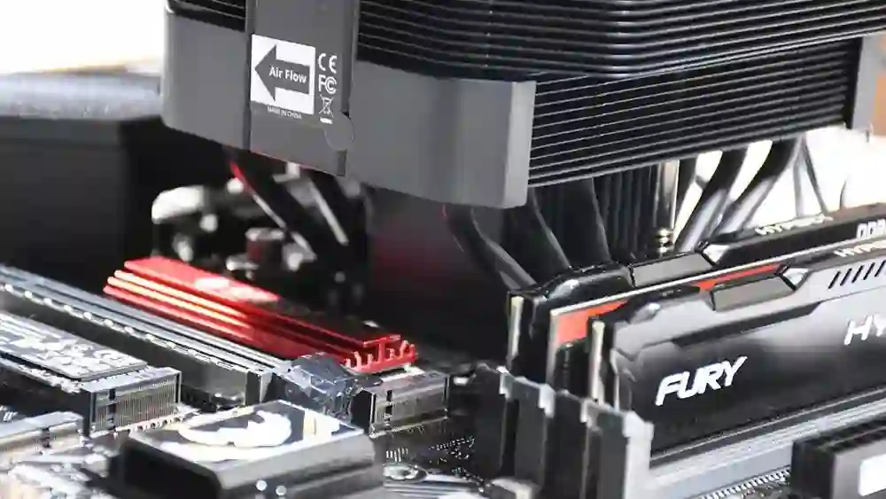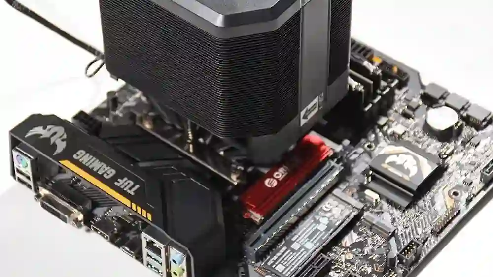 最后将主板连同零件重新归位到机箱内,需要注意的是 T620M 黑武士散热器的体积比较大,在安装到 M-ATX 规格的主板上会占用一定的空间,导致主板上一些螺丝孔位和插槽不太便于操作,就以我的这块主板为例就挡住了一条 PCIE M.2 硬盘插槽。切记不要忘记接通风扇的供电及散热器 RGB 灯光的供电和控制器。