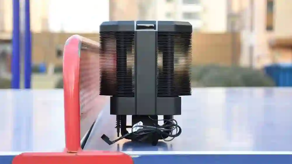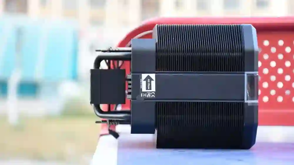 机身较宽的两个侧边是层层叠叠的格栅,较窄的两个侧边中间有一条金属挡板贯穿。黑武士散热器的风扇安装在这两块金属挡板之间,从侧边透过格栅可以隐约的看到,这款风扇是 SF120R 聚流型风扇,拥有九片扇叶,具有极强的穿透力。