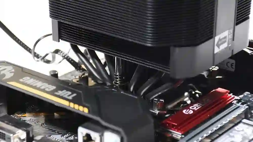 将 T620M 黑武士纵向朝下放置,使两侧的长螺丝与金属支架中间的螺丝孔位吻合,使用螺丝刀拧紧两颗螺丝即可。这两颗螺丝拧紧以后会有明显的反馈,因此也无需担心用力过猛导致 CPU 被散热器压迫。