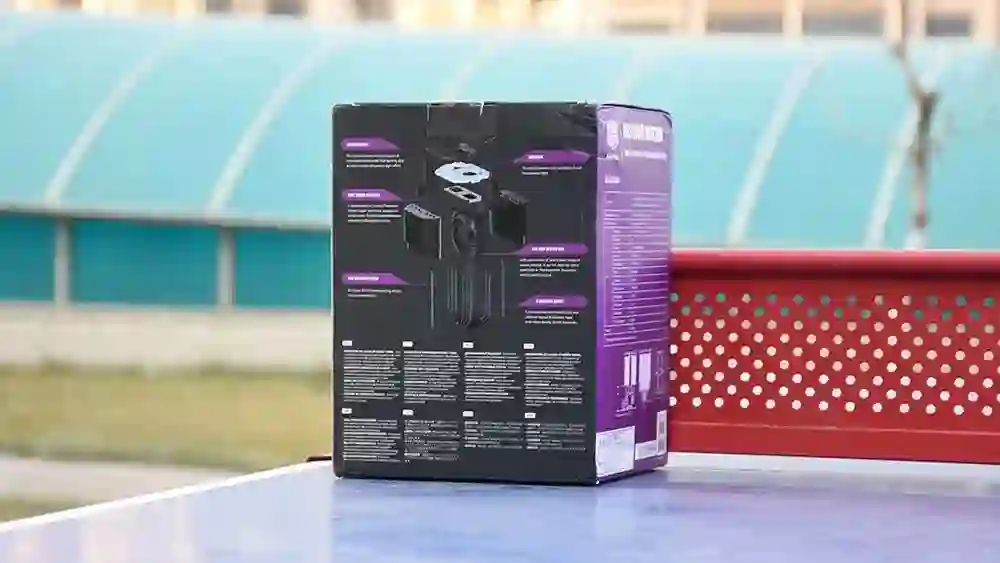 酷冷家族的产品在包装上已经形成了具有品牌识别性的风格,经典的黑紫配色已经深入人心。盒子正面印有酷冷 T620M 黑武士散热器的机身渲染图,左上角为酷妈品牌标识,右上角印有 Aura 灯效的相关说明,最下方则是产品的全称以及相关说明。