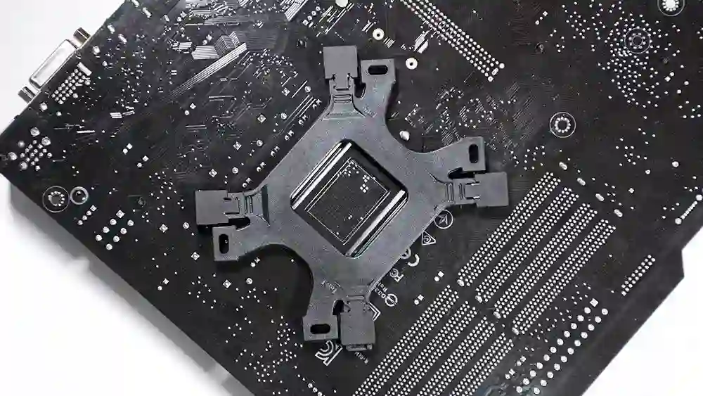 大多数的第三方散热器都是采用背板固定的方式,酷冷 T620M 黑武士也不例外,随机附件中的黑色塑料支架就是要放置在主板背后的,这个支架也是符合支架,兼容 Intel 和AMD 两种平台的主板,在对应的位置都有标记。