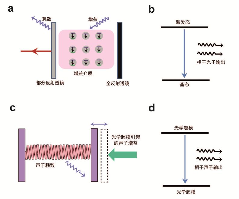 声子激光是光学激光的声子版本,可以在具有光机械效应的耦合光学微腔中实现。在这类系统中,通常可以找到两个耦合的光学模式,这两个耦合光学模式会形成两个光学超模,这两个光学超模类似于光学激光中的增益介质可以看成一个模拟的二能级系统,这个模拟二能级系统和声学场相互作用可以形成相干输出产生声子激光。图1中给出了通常的光学激光与声学激光原理的比较,图1a,b中给出的通常的光学激光表明,作为激光模式的光学场与光学腔中的增益介质二能级系统相互作用,形成相干的光学输出即为光学激光。声子激光的机理可完全类比光学激光(参见图1c,d),在声子激光中,声学模式取代光学激光中的光学模式,光学超模组成的等效二能级系统代替光学激光中的增益介质中的二能级系统,通过声学场与等效二能级系统的相互作用,可以形成相干的声学输出,即为声子激光。