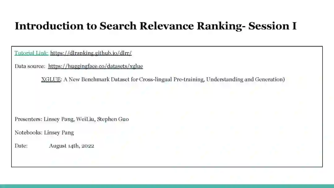 在本教程中,我们将概述搜索排名的实践,并演示各种经典和流行的排名算法,以帮助读者理解搜索相关性算法及其在现实世界中的应用。本教程大纲如下:搜索相关性排名介绍:在这一环节中,我们将概述信息检索[9]中的排名问题。回顾了排序函数的一些早期工作,并简要介绍了各种排序函数模型的历史。我们选择了一些关键的算法来使用真实数据解释和演示它们的排名表现。我们介绍了几个关键的性能指标来评估排名和在线指标。我们的实践课程涵盖了经典排名函数的实现。基于注意力的搜索相关性模型:在这一环节中,我们将概述序列模型的发展,然后讨论注意力机制。我们还将介绍Transformer架构,以及如何在搜索排名系统的上下文中利用其中一些架构。具体内容如下: (1) 我们介绍了序列模型(如RNN和LSTM)是什么,训练它们时所做的假设是什么,它们更适合于搜索排名系统的哪种数据集。(2)注意力/自注意力: 我们解释一般注意力机制。(3) Transformer:与上述两点类似,我们以真实的搜索排序和自然语言处理任务为背景来解释和激发Transformer架构。(4) 操作会话封面训练:注意力/Transformer模型。知识蒸馏的搜索相关性: 在这一环节,我们提供了一个介绍的深度结构化语义模型(DSSM)[3],已广泛采用在工业中,其质量和高效的架构。我们还介绍了最近的NLP突破,BERT[2]在对查询文档对进行评分方面明显优于DSSM及其变体。然而,我们表明,它的Transformer交叉层同时是昂贵的,因此它不允许离线预计算文档。为了连接两者,我们将我们提出的知识蒸馏[5]从教师BERT模型分享到学生模型。新的学习方法明显胜过传统的DSMM模型,从点击中学习。在实践环节中,听众接受了关于在开源数据集上搜索相关性的知识提炼的培训。提供的代码示例用于训练双塔学生模型,测试数据集用于听众体验教师和学生模型之间的度量差异。