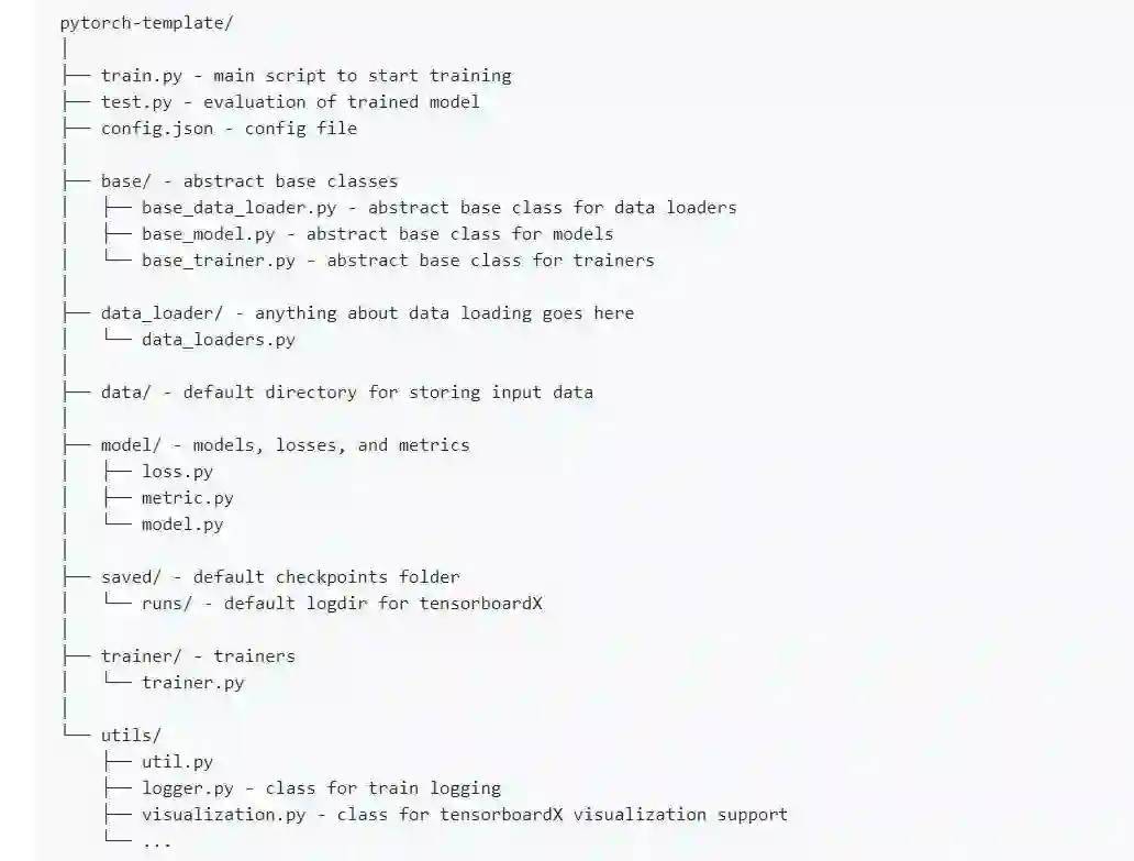 这一部分主要介绍了 PyTorch 其它各种资源,包括教程论文列表、个人的学习经验与实践、好用的 PyTorch 插件等。这一部分相对于其它部分比较散,但是有一些项目还是非常有意思的,例如在 PyTorch 项目模板中,其介绍了构建 PyTorch 项目一般所采用的结构,包括文件夹及文件结构、各文件的编写规范和示例等。这个项目一直在更新,下图展示了构建 PyTorch 项目的一般文件结构: