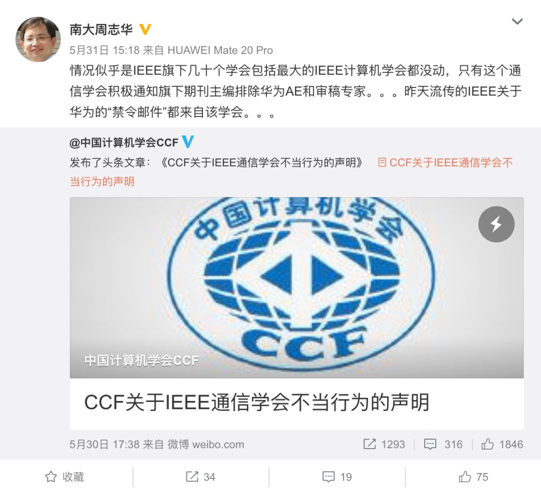 5 月 30 日晚,中国计算机学会(CCF)发布了一份声明,宣布将采取三项抵制措施限制与 IEEE 旗下机构 ComSoc(IEEE 通信学会)的交流与合作: