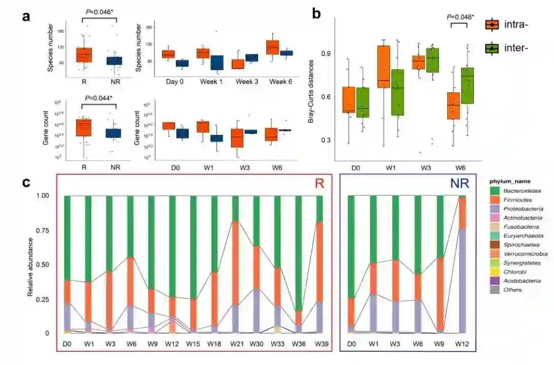 基于DNBSEQ测序平台的宏基因组测序结果发现,整体而言,R组比NR组显示出微生物组更高的物种和基因数目(图1a)。而基于Bray-Curtis距离的β-多样性分析显示,R和NR两组菌群结构在治疗早期时间点并没有显著差异,而从第6周开始,R和NR两组之间显示出了显著的组间差异(图1b,图2 a-d)。进一步对患者的菌群组成进行动态检测,发现治疗开始前R组和NR组的粪便菌群均以革兰氏阳性的厚壁菌门、革兰氏阴性的拟杆菌门、变形菌门为主,与健康成人的研究结果基本一致,初步推测这些患者在基线状态时并未发生严重的肠道菌群失调。