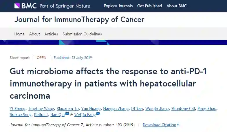 2019年7月,锐翌基因与浙一医院肿瘤内科团队基于华大智造DNBSEQ技术平台在《Journal for ImmunoTherapy of Cancer》合作发表研究成果《Gut microbiome affects the response to anti-PD-1 immunotherapy in patients with hepatocellular carcinoma》。研究采用深度宏基因组测序的方法,研究肝细胞性肝癌患者接受抗PD-1治疗的过程中肠道菌群的变化特征,鉴定出与治疗响应度密切相关的菌群及其代谢特征,旨在为进一步探究肠道菌群与宿主免疫应答的关系初步奠定理论基础。