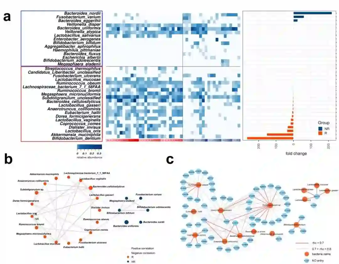 R组的富集菌还包括1种毛螺菌科细菌(Lachnospiraceae bacterium 7_1_58FAA) 及2种瘤胃球菌(Ruminococcus obeum, Ruminococcus bromii),以及嗜粘蛋白艾克曼菌(Akkermansia muciniphila)。有文献表明, 嗜粘蛋白艾克曼菌A.muciniphila和瘤胃球菌能够维持正常肠道通透性,调节全身免疫,从而有益宿主健康。之前曾有文献发现,在抗PD-1免疫治疗的黑色素瘤患者中,瘤胃球菌科(Ruminococcaceae)相对丰度显著增高,而在2018年发表于Science杂志的一项研究中,作者发现口服补充A. muciniphila有利于提高MCA 205肉瘤和RET黑色素瘤小鼠模型对PD-1免疫治疗的响应度。研究进一步用SparCC算法研究了R组和NR组中分别富集的物种之间的相关性(图4b),发现R组中富集物种之间的关联显著程度均高于NR组,其中4个乳酸菌之间的相关性最强,说明它们之间可能有着比较密切的代谢互作。
