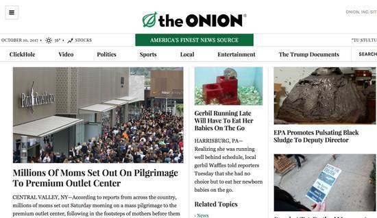我们所说的美国假新闻,通常包括两种类型:讽刺恶搞,最知名的就是洋葱新闻或者知名媒体的讽刺专栏;虚假新闻,最常见就是去年美国大选期间冒出来数以万计的各种假新闻网站,其中不少来自东欧地区。