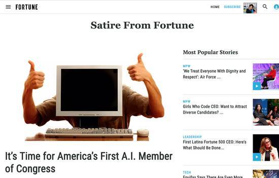 辟谣要溯源,随手谷歌了下。果然,这是来自《财富》杂志网站的恶搞专栏。虽然《财富》网站已经在文章多处打上了“幽默、讽刺”的明显标签,但还是挡不住部分粗心的国内媒体主动跳坑,把一篇恶搞讽刺文章当作严肃新闻来报道,而且第一时间抢发传播获取最大流量。