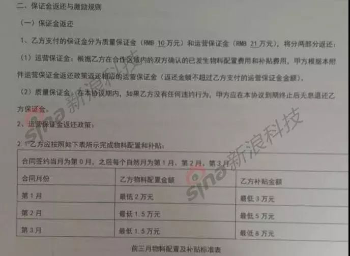 新文自己便是这批代理商中的一员,其合同条款中标明,代理商一共需要缴纳保证金31万元,其中10万为质量保证金,在结束合作时给予退还;另外21万为运营保证金,需要他在当年5月至7月在物料配置和补贴上投入21万,否则不予退还。