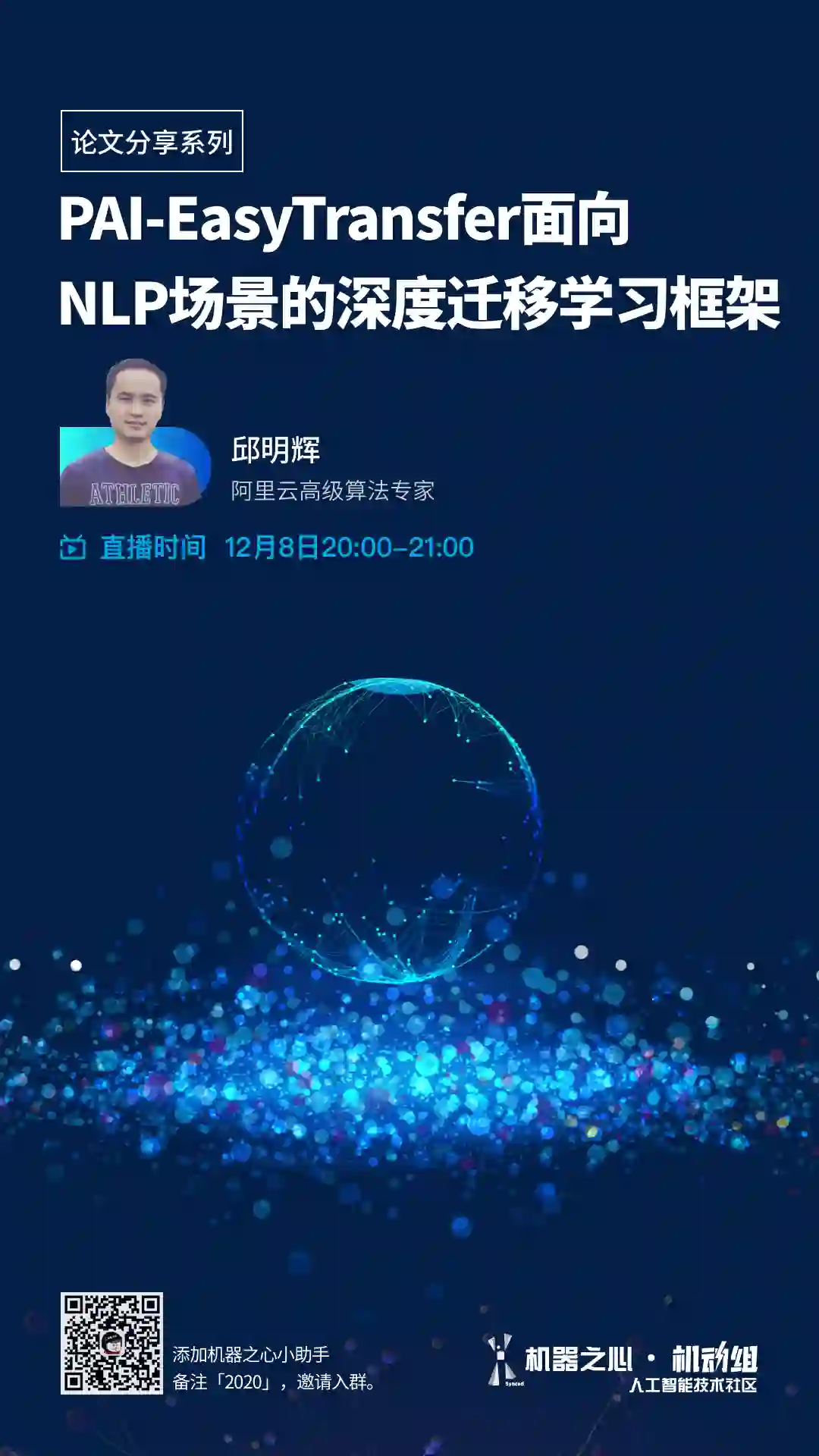 加入机动组,一起看直播 「机动组」是机器之心发起的人工智能技术社区,将持续提供技术公开课、论文分享、热门主题解读等线上线下活动,并在社群中提供每日精选论文与教程、智能技术研究周报,同时「机动组」也将不定期组织人才服务、产业技术对接等活动,欢迎所有 AI 领域技术从业者加入。添加机器之心小助手(syncedai5),备注「2020」,加入本次直播群。