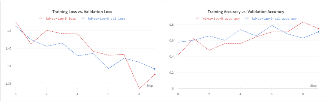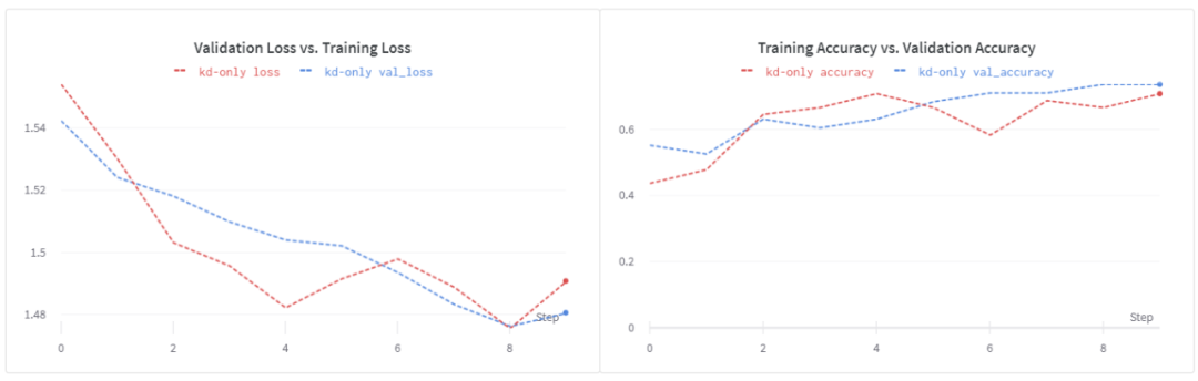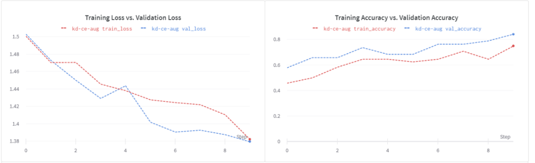 现在让我们看看在蒸馏训练目标中加入ground truth标签是否有帮助。在β = 0.1和α = 0.1的情况下,我们得到了大约71%的验证准确性。再次表明,更强的正则化和更长的训练时间会有所帮助。