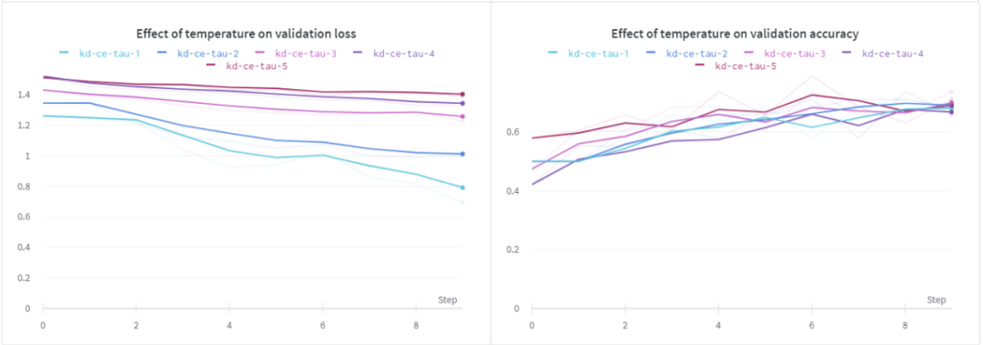 从上面的结果可以看出,当τ为1时,训练损失和训练精度均优于其它方法。对于验证损失,我们可以看到类似的行为,但是在所有不同的温度下,验证的准确性似乎几乎是相同的。