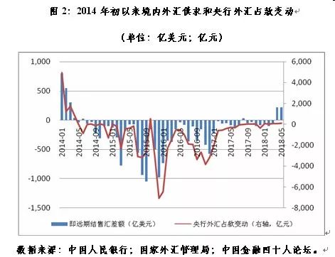 作为制度中性,汇率市场化本身没有也不应有升值、贬值的政策偏好。实际上,2018年以来,不论人民币汇率急涨还是急跌,央行信守政策中立,基本退出了外汇市场常态干预。前5个月,出口较快增长,累计同比增长13.3%,较上年同期增速高出6.2个百分点,但因进口增速高达21%,进出口顺差同比减少27%;外汇供求基本平衡,银行即远期结售汇顺差累计214亿美元,上年同期逆差441亿美元;央行外汇占款增加329亿元,上年同期减少3929亿元(图2)。