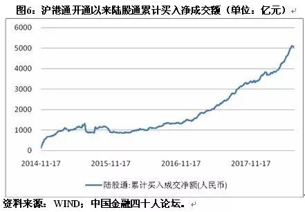 其次,中国经济稳中向好的发展韧性有待检验。4、5月份,中国投资和消费增长放缓引发了市场看空情绪。然而,在新旧动能转换、经济震荡筑底过程中,经济指标时好时坏在所难免。对于做趋势的长期投资者来讲,仍是进入的机会。2018年前5个月,境外机构新增国债和政策性银行债持有2369亿元,去年同期为减少23亿元;上半年(截至6月28日),陆股通累计买入净成交额新增1602亿元,同比增长66%,甚至6月份国内汇市股市震荡期间,还累计净流入了285亿元(图5和图6)。