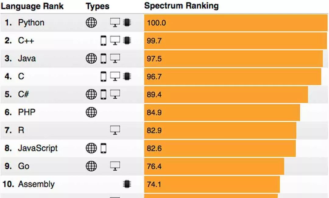 让我们看看 2018 年排在前十的编程语言。Python 已经与 C++ 和 Java 一起保持了很长时间的流行度,但更有趣的是,JS 和 GO 语言的增长已经表明它们一直在以令人难以置信的速度追赶,相信它们在未来会攀上阶梯之巅。