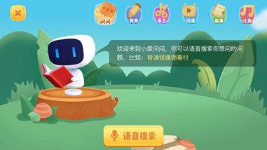 “小度乐园”的语音搜索功能更加突出,孩子可以直接提问就能看到搜索结果,好像随身携带了一本可以轻松查看的“百科全书”,不仅能支持 “听问题”、“搜结果”“播答案”之外,还具备“听写”和“背诵检查”等多重教育能力。孩子只需要选择对应课文和诗句,就可以对这些内容进行学习和巩固。除了教育学习的内容,小朋友们常见的搜索动画片、儿歌、故事的需求也可以通过“小度乐园”的语音搜索能力来满足!