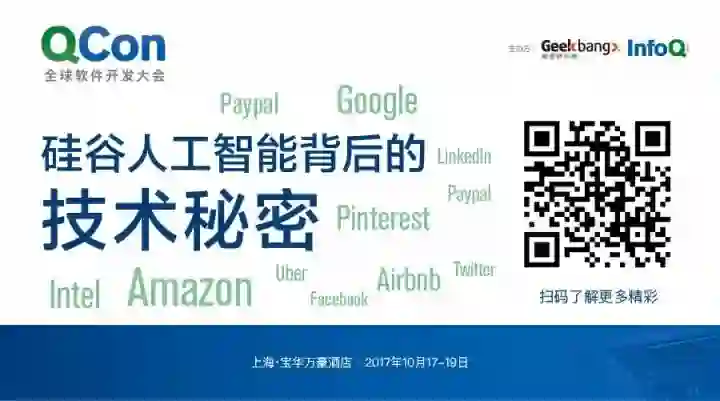 Google 如何用 AI 造聊天机器人?Pinterest 如何用机器学习获得两亿活跃用户?10 月 QCon 上海站,还有来自 Uber、Paypal、LinkedIn、Airbnb 等顶尖技术专家前来分享前沿实践经验。QCon 报名即将结束,识别下方二维码或点击【阅读原文】与 100+ 国内外技术大咖零距离,如有问题欢迎联系票务经理 Hanna ,电话:15110019061,微信:qcon-0410。