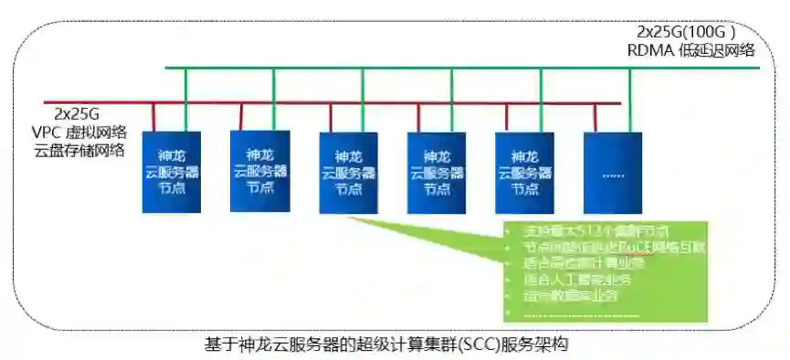 针对高性能计算场景,阿里云也将推出基于神龙云服务器的超级计算集群(SuperComputer Cluster)服务产品,在集群内,各节点间高带宽低延迟的 RDMA 网络互联,保证了高性能计算应用需求的高度并行效率。同时,RoCE(RDMA over Convergent Ethernet)网络速度达到 Infiniband 网络的性能,且能支持更广泛的基于 Ethernet 的应用。基于神龙云服务器构建的 SCC 集群,和阿里云 ECS,EGS 等计算类产品一起,为阿里云弹性高性能计算平台 E-HPC 提供了堪比超算中心的并行计算资源,使云上超算真正实现。