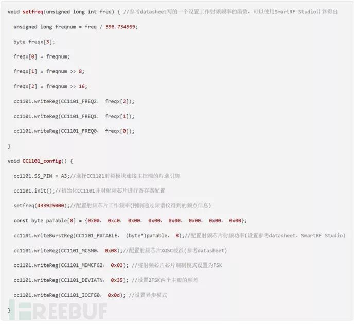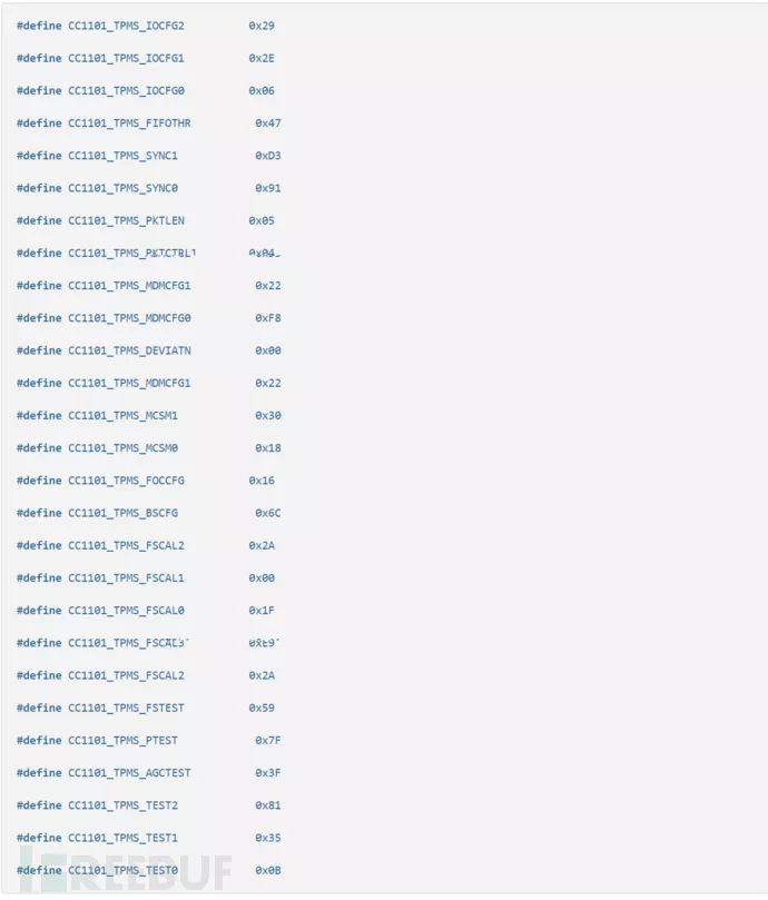 这个是根据胎压传感器信号生成的CC1101寄存器的配置,可以通过SmartRF Studio配置完参数后导出,不过有些寄存器是不支持IDE去进行设置的,必须是根据芯片的datasheet去修改的,比如说让射频芯片处于异步模式,切换射频芯片的工作状态等等。