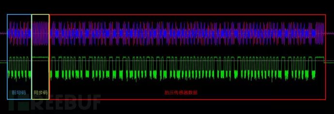 这个就是整一段胎压传感器发射出来的信号了,前面是前导码用于唤醒接收端使用的,前导码后面一个特别长的脉冲信号是同步引导码用于发射端和接收端同步时钟使用的,后面就是胎压的有效数据了,我们可以对这个有效数据进行分析了。