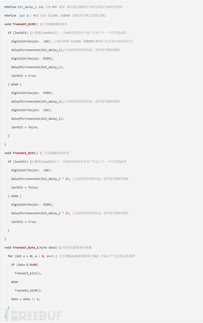 然后这个是发射数据操作函数,算出CRC数据后根据Transmit_data的数据内容在GDO0这个引脚上输出对应的波形。