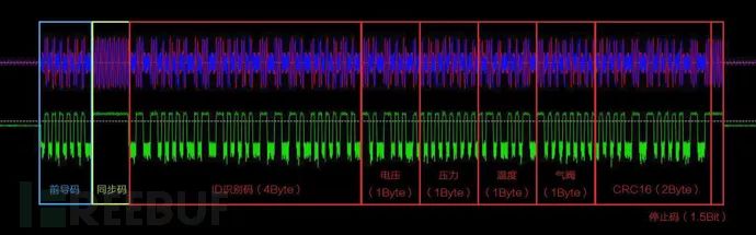 通过多次对多台胎压监测设备以及多个传感器器的信号进行行行采样、逆向分析得到其信号的数据结构为: