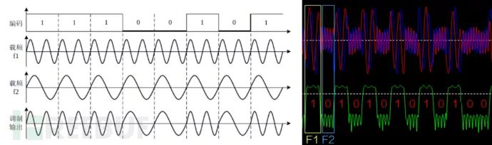 2FSK调制方式简单来说就是两种频率来表示 Bit 0,Bit 1,如图所示假如我们要发射11100101,这段数据在要发送Bit 1数据时候频率切换成了载波频率F1,要发送Bit 0数据时候切换到载波频率F2,最后的调制输出就是我们用软件无线电接收到的结果了,然后我们可以通过这种方式将信号数据解调下来了进行分析了。