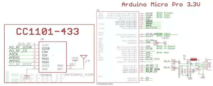 之后我们就可以根据这个去发射伪造传感器的数据了,这里我使用的TI的CC1101 射频芯片,我们通过Atmega32u4通过SPI(MOSI,MISO,SCK,CS)配置射频芯片CC1101的相关射频寄存器,然后通过CC1101的GDO0引脚将射频数据发出,也可以采用数据包模式将数据发射出来,但是因为数据包模式不方便兼容其他的类型的胎压设备。