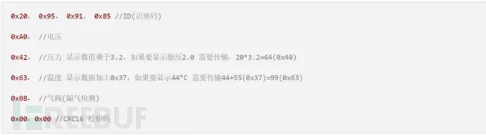 ID识别码 (4 Byte)+ 电压 (1 Byte) + 压感 (1 Byte)+ 温度 (1 Byte) + 气阀 (1 Byte) + CRC (2 Byte)+停止码(1.5Bit)