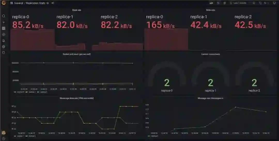 图 1 显示了指标仪表板。你可以看到在这个快照中,replica-0 是领导者,其他副本是跟随者。由于其他复制体的回执,复制体 -0 的读取率非常高。
