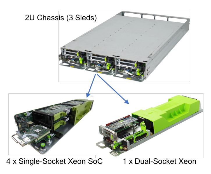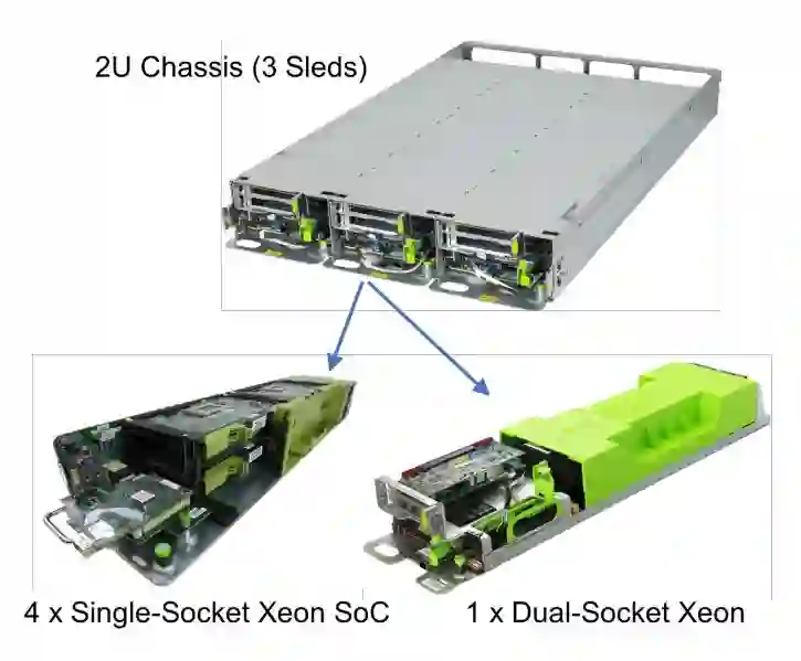 2U Chassis,具有三个计算插槽,支持两种可供选择的服务器类型。一个是单插槽 CPU 服务器(1xCPU),包含 4 个 Monolake 服务器子卡,另一个是双插槽 CPU 服务器(2xCPU)。