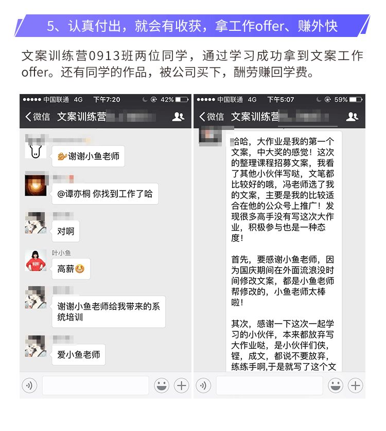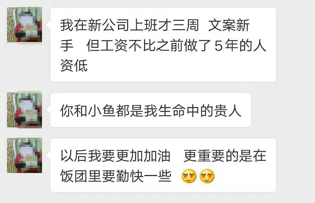 在文案训练营,通过学习,每期都有靠文案零花钱、成功转岗专职文案的同学。