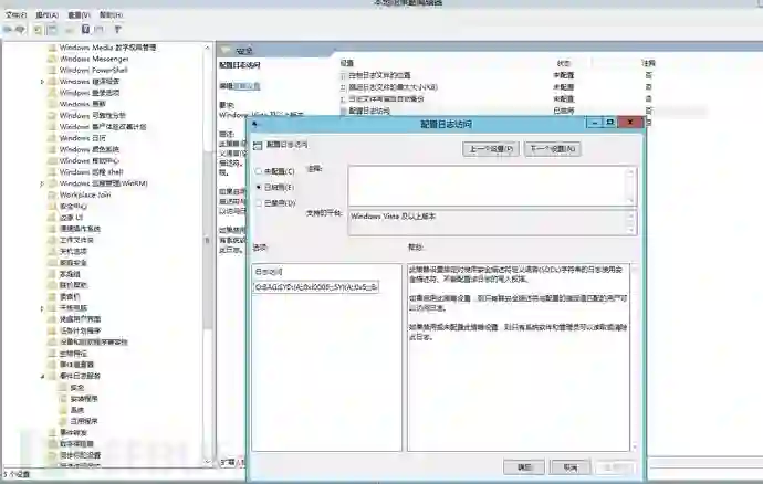 然后双击后,选择已启用,将 wevtutil gl security 中的值和(A;;0x1;;;NS)加入到配置项中 ,如