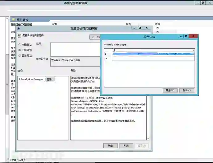 组策略-> 计算机配置 -> 管理模板 -> windows 组件 -> 事件转发 -> 配置目标订阅管理器(即就是我们的server端地址)