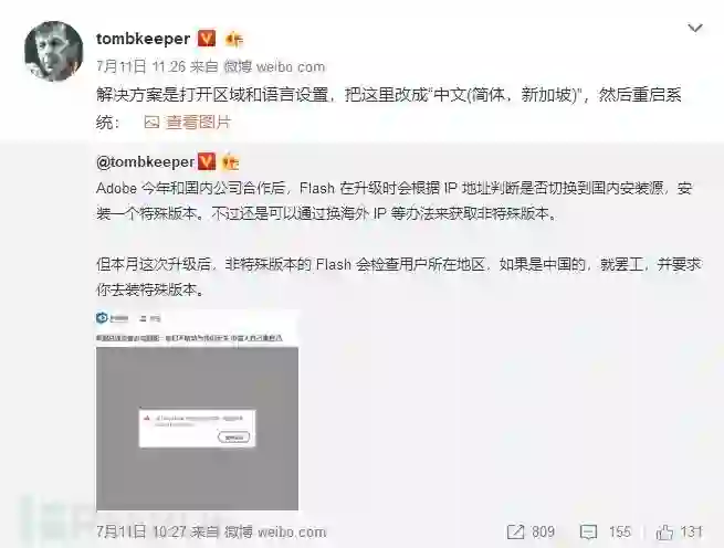 安装海外版Flash,TK大佬在微博上给出了方法,“打开区域和语言设置,改成中文(简体,新加坡),重启”,就能够顺利安装上海外版本。这个方法网友可以自行测试,笔者在挂上梯子的情况下进入“https://get.adobe.com/cn/flashplayer”这个链接下载,发现并没有跳转中国版官网,并且可以顺利以原来的方式安装Flash Player,这种方法也仅供参考,很有可能随时挂掉。
