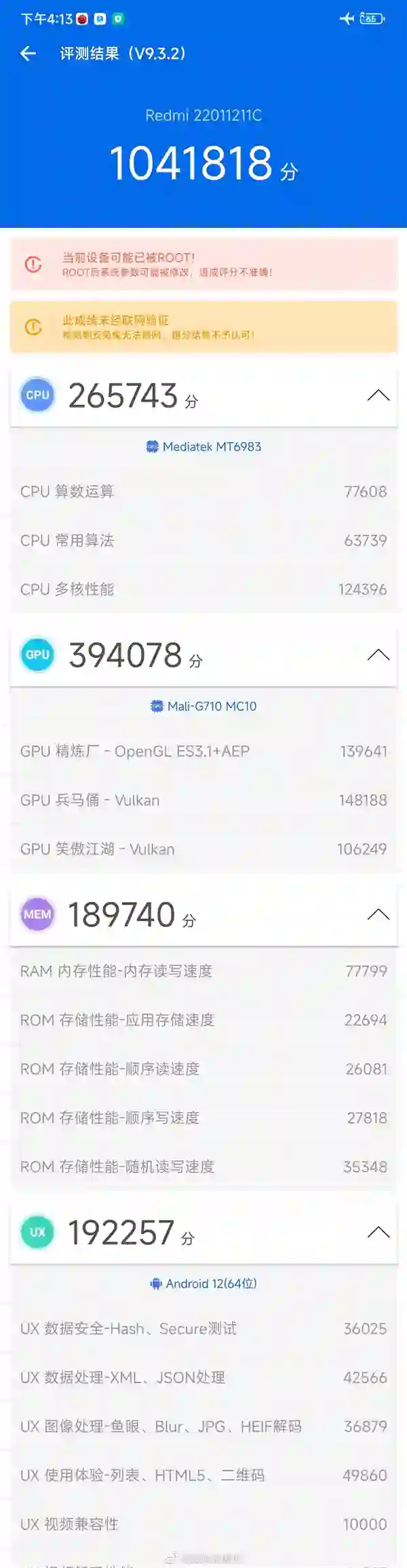 根据@数码闲聊站曝光的跑分截图,Redmi K50 Pro+ 搭载了天玑 9000 处理器,综合成绩达 1041818 分,CPU 部分测试成绩 265743 分,GPU 部分测试成绩 394078 分,MEM 部分测试成绩 189740 分,UX 部分测试成绩 192257 分。