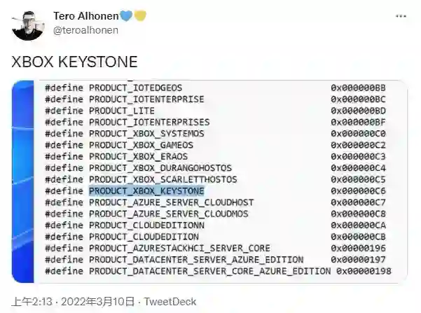 据 Gamerant 报道,业内人士 Tero Alhonen 发现了一个代号为 Xbox Keystone 的新项目。Xbox 喜欢给新项目起一个代号,在 2019 年的 E3 展会上,Xbox 宣布了代号 Scarlett,也就是后来推出的 Xbox Series X 主机。