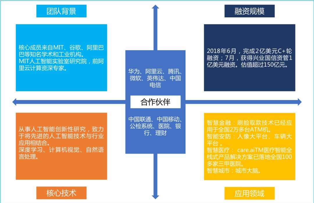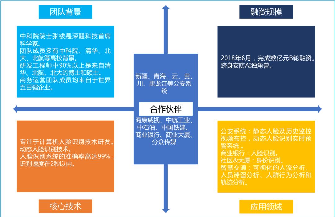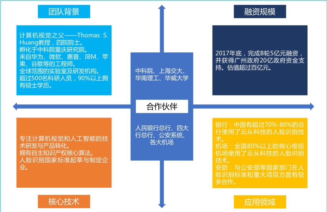 云从科技成立于2015年,孵化于中科院重庆研究院,专注于计算机视觉与人工智能等技术的研发,具有国家队背景。其成立的目的是重点转化人脸识别技术、人群监测技术、警用图侦技术和交通识别技术等科研成果。目前三大业务线包括金融、安防及创新,产品覆盖银行、安防、民航等领域,是国内银行业人脸识别的第一大供应商。