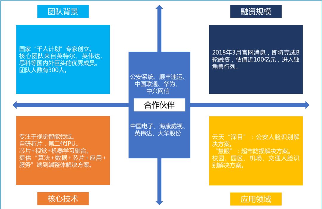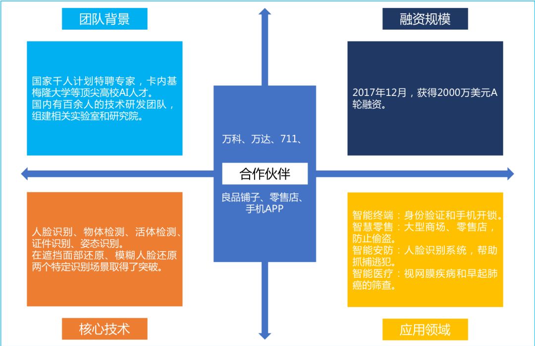 依图科技成立于2012年,致力于人工智能的研发工作。其计算机视觉技术目前主要应用在安防、金融以及医疗领域三大领域。在安防领域,公司研发的“蜻蜓眼”人像大平台已服务全国上百个地市公安系统,是全国唯一拥有十亿级人像库比对能力的公司;在金融领域,截止2015年,招商银行 1500 多个网点接入了依图系统,刷脸取款技术已经应用于全国2万多台ATM机。