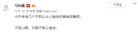 这条微博里,他讲到了4个关于美食的经历,但无一例外的,体验都不太美好。