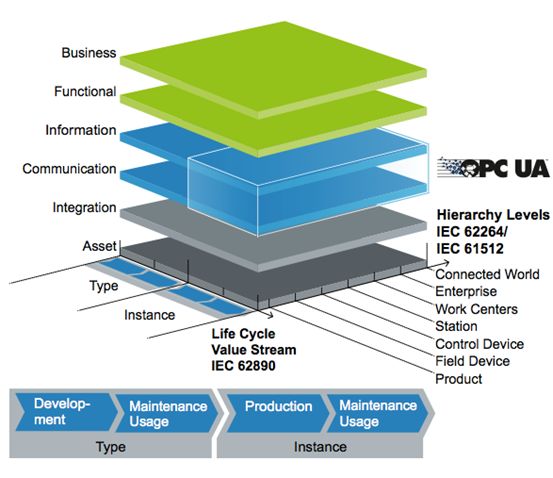 工业4.0一开始就定义了自身的顶层架构RAMI,它从三个维度对工业4.0进行了框架描述,代表了德国对工业4.0所进行的全局式思考。有了这个模型,各个企业尤其是中小企业,就可以在整个体系中寻找到自己的位置。这是一股前所未有的洪流交融,万物、人机、软硬、虚实都要连接,需要一种全新的通讯观,才能实现这种集成。从国外的工业巨头如西门子的实践来看,基本是按照这样的通讯框架进行全域构建。